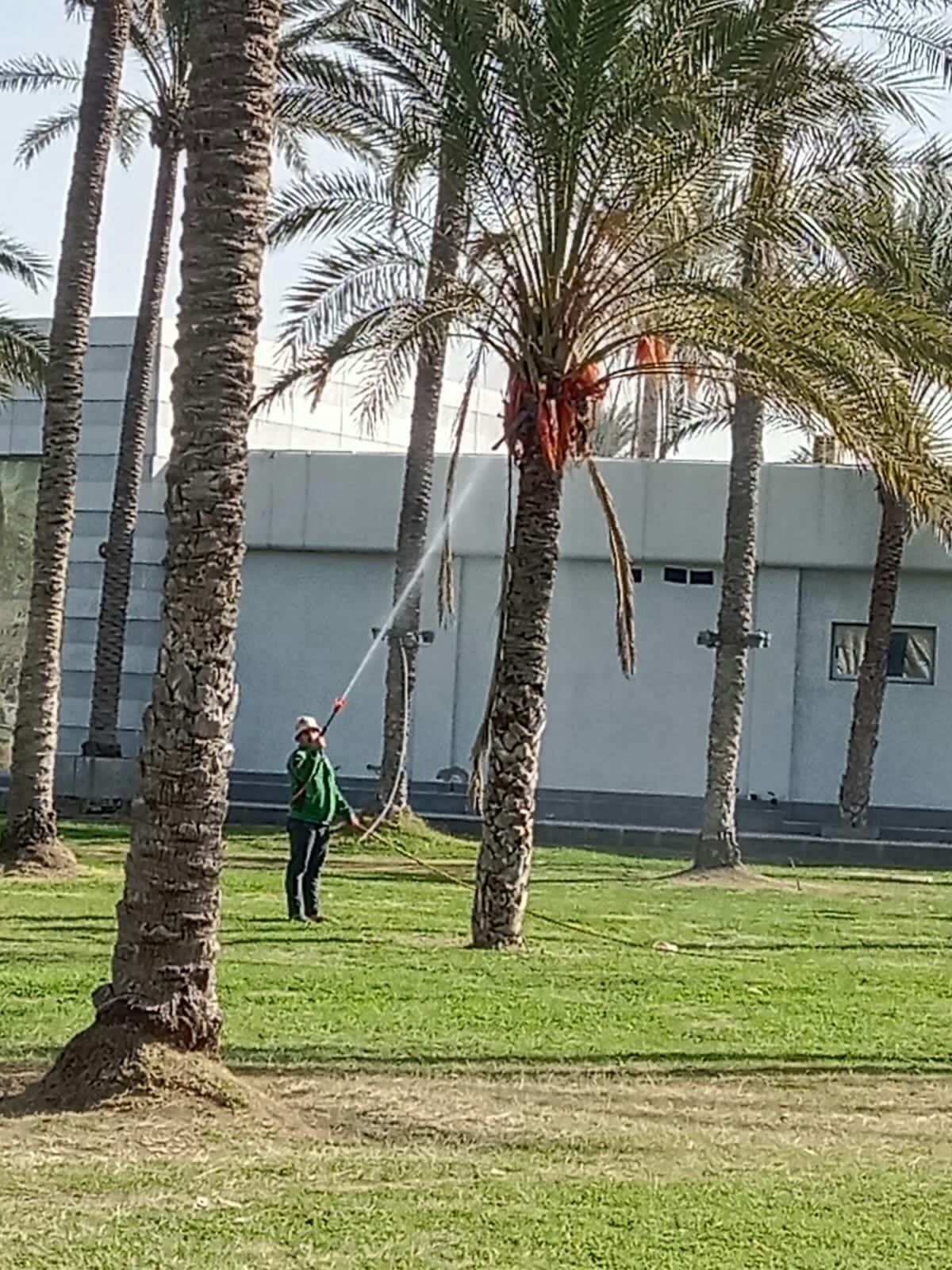 المرور الدوري والإشراف ومتابعة فحص ورش النخيل ضد الإصابة بحشرة سوسة النخيل الحمراء وذلك للحفاظ على الثروة النباتية بحدائق المنتزة .