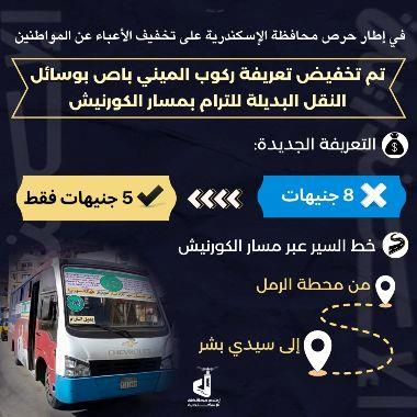 تخفيض تعريفة ركوب الميني باص بوسائل النقل البديلة لترام الرمل لتصبح 5 جنيهات فقط بدلا من ٨ جنيهات.