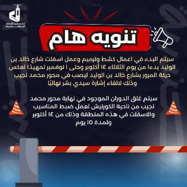 تنويه هام بشأن اعمال كشط وترميم وعمل اسفلت شارع خالد بن الوليد