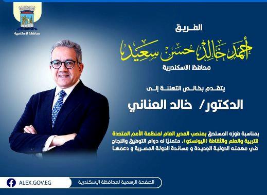 الفريق أحمد خالد حسن سعيد محافظ الإسكندرية يتقدم بخالص التهنئة إلى الدكتور خالد العناني