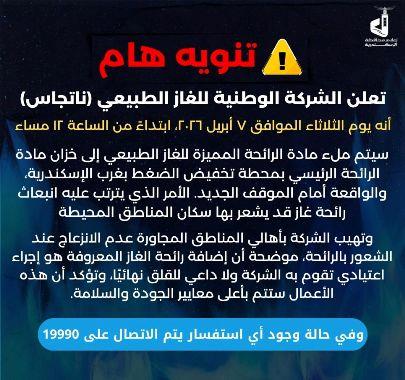 أنه يوم الثلاثاء الموافق ٧ أبريل ٢٠٢٦، ابتداءً من الساعة ١٢ مساء، سيتم ملء مادة الرائحة المميزة للغاز الطبيعي