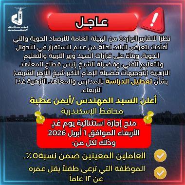 أعلن المهندس أيمن عطية #محافظ_الإسكندرية منح إجازة استثنائية يوم غدٍ الأربعاء الموافق ١ أبريل ٢٠٢٦