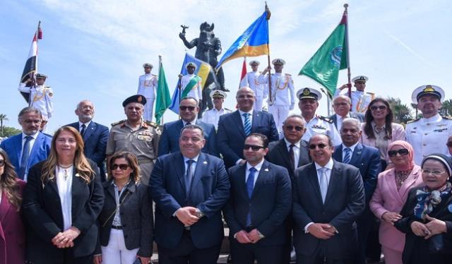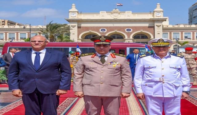 محافظ الإسكندرية وقائد المنطقة الشمالية العسكرية، ومدير أمن الإسكندرية، يضعون أكليل الزهور على النصب التذكاري للشهداء