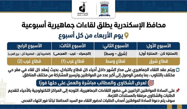 توضح محافظة الإسكندرية أن اللقاءات الجماهيرية ستُعقد يوم الأربعاء من كل أسبوع، مع تبادل أماكن انعقادها بين الأحياء على مدار الشهر