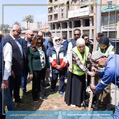 وزيرة التنمية المحلية والبيئة ومحافظ الإسكندرية يتفقدان أعمال زراعة الجزيرة الوسطى بشارع مصطفى كامل