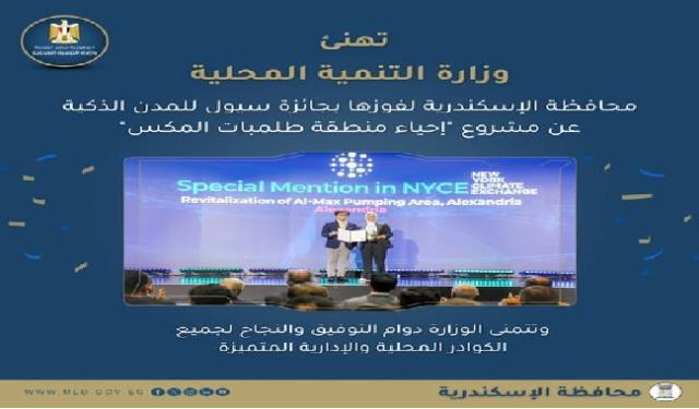 حيث تتقدم وزارة التنمية المحلية بخالص التهنئة إلى محافظة الإسكندرية بقيادة الفريق أحمد خالد محافظ الإسكندرية، بمناسبة فوزها بجائزة (Special Mention in Partnership with NYCE)