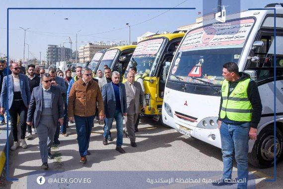 محافظ الإسكندرية يتفقد اصطفاف وسائل النقل البديلة لترام الرمل المقرر تشغيلها